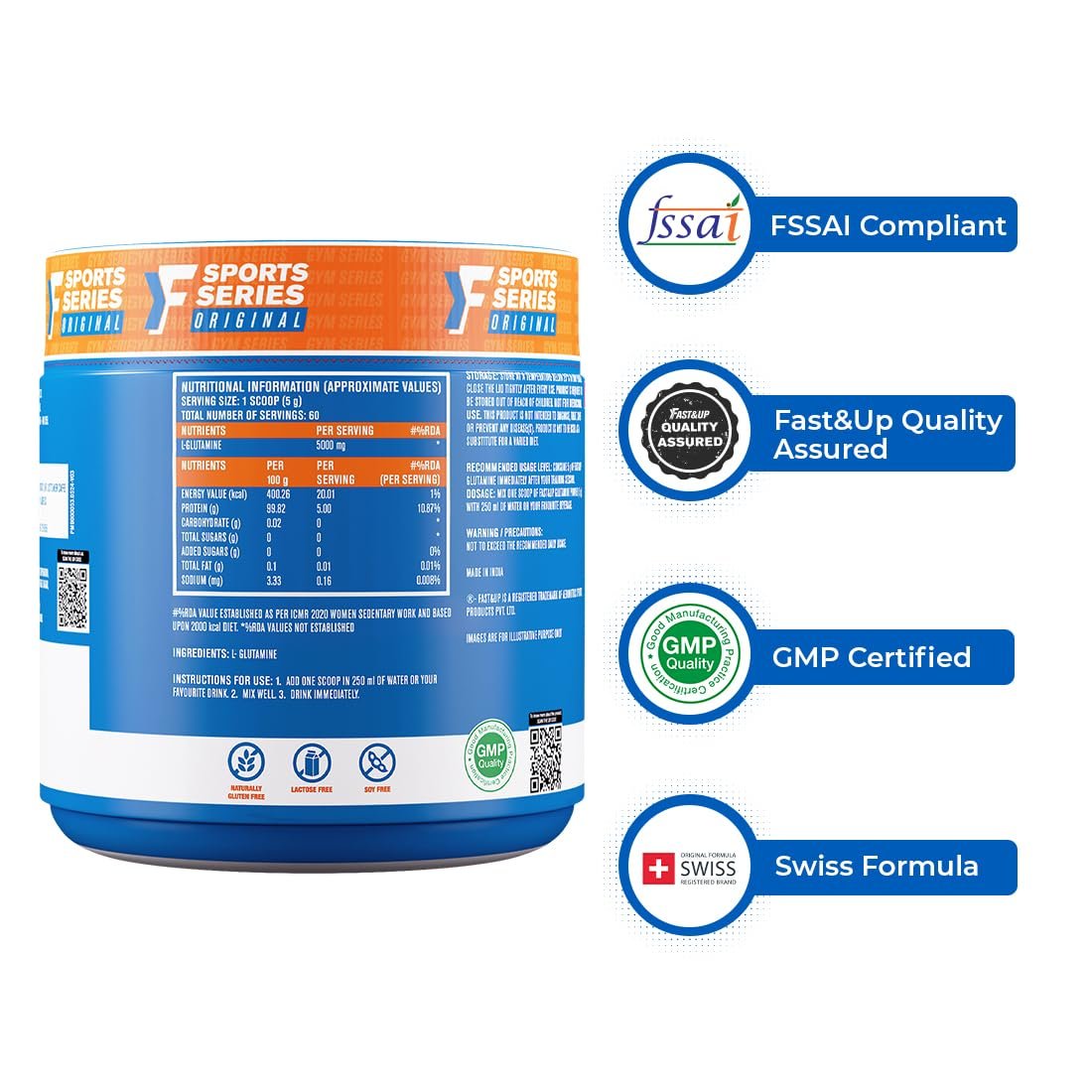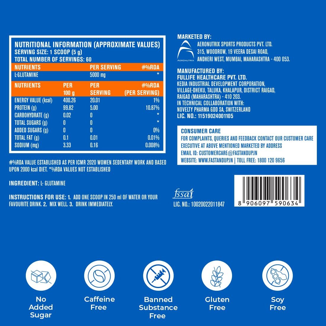 Fast&Up Glutamine has been formulated to deliver 5g of micronized L-Glutamine supplements to help maximize muscle recovery and performance. This ideal post workout supplement supports your immune system and boosts muscle recovery after strenuous workouts. Glutamine helps in overall muscle recovery post activity. It helps decrease muscle soreness through improved muscle repair and glycogen repletion. Maintaining a high nitrogen balance in the muscle prevents muscle breakdown, therefore retaining more muscle. Glutamine has several functions including the support of immunity, gastrointestinal integrity, insulin secretion, neurological activity, and muscle protein synthesis. Mix 1 scoop with 250ml of water. Shake well to dissolve. Drink during or post exercise on training days or after any sport event for good recovery. For best results, use 2 scoops on training days.