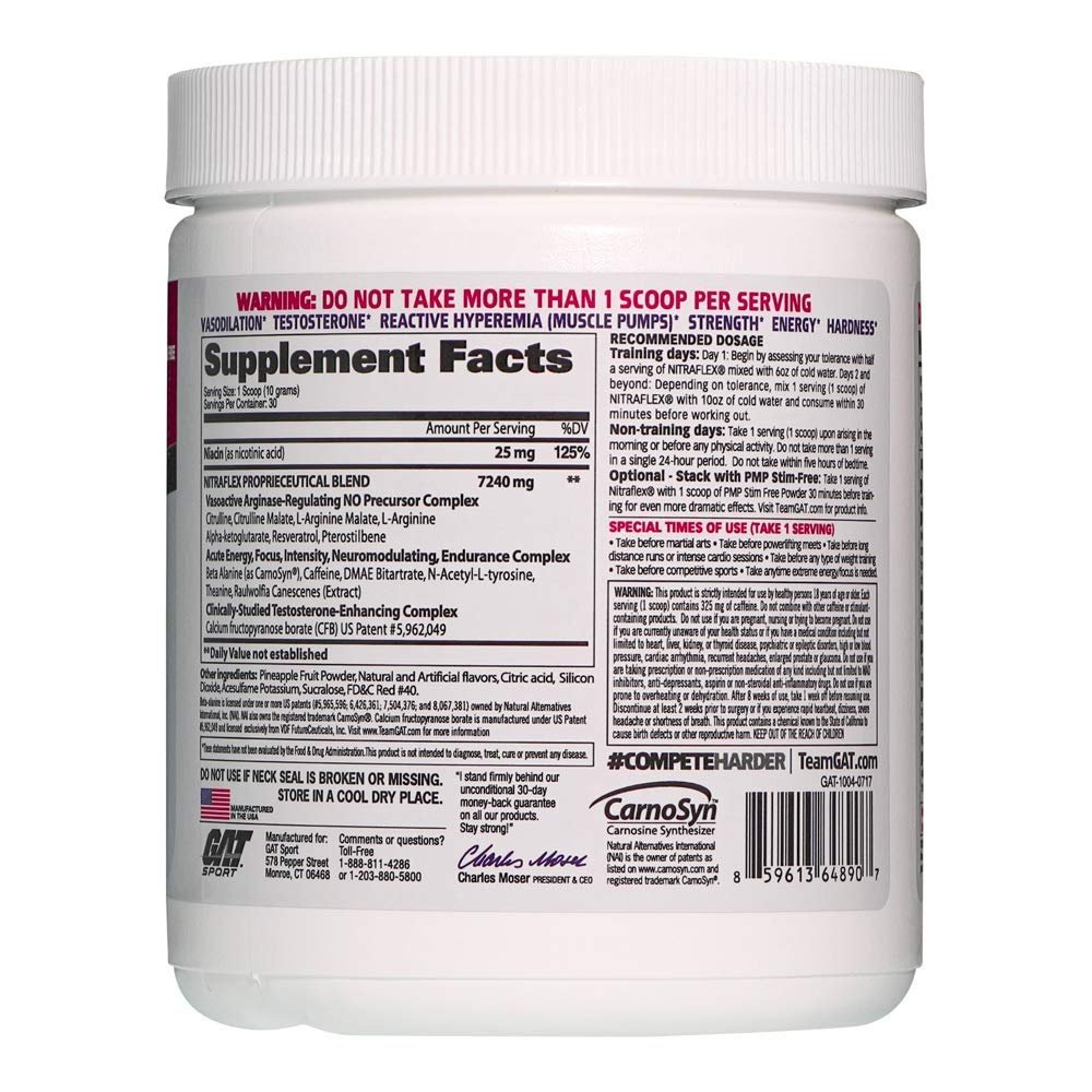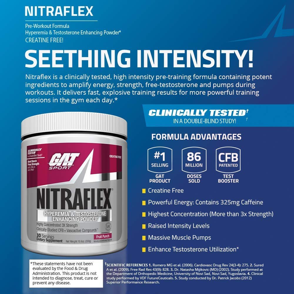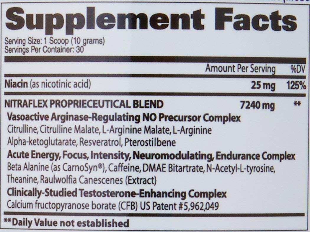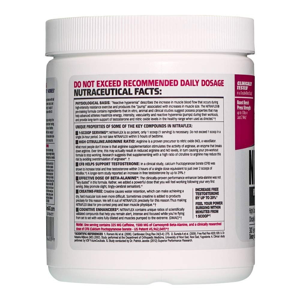 This clinically tested, high-intensity pre-training formula has potent ingredients to help magnify energy, alertness, strength, stamina, pumps and free testosterone during workouts. Nitra flex pre-workout delivers fast, explosive training results for a more powerful body, including energy, stamina, nitric oxide (no) and testosterone levels. It contains proven muscle building l-citrulline malate, l-arginine, l-arginine alpha-ketoglutarate (akg) amino acids and calcium fructoborate (cfb), a natural, high potency form of boron which has been shown to support free testosterone.